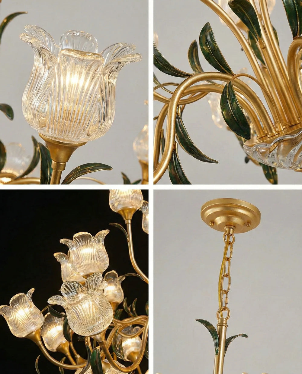 This fixture features a French Country and Vintage aesthetic. The gold finish with green leaf accents and glass tulip shades makes it a perfect romantic centerpiece for dining rooms or bedrooms.
