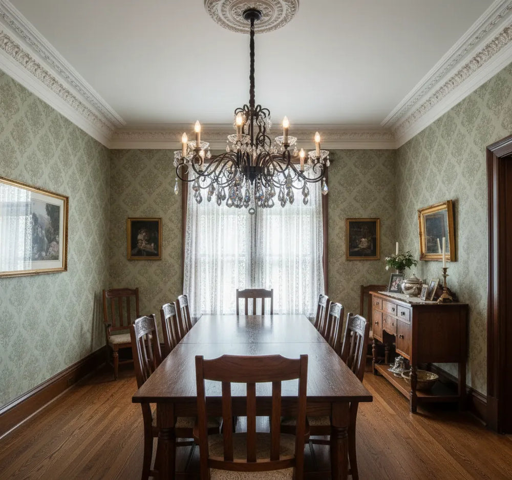 The Isabella transforms the mood instantly. With its rustic black iron curves and sparkling crystals, it casts a soft, candle-like glow that elevates any evening. No harsh glare. No empty ceilings. Just a stunning centerpiece that sparks conversation.