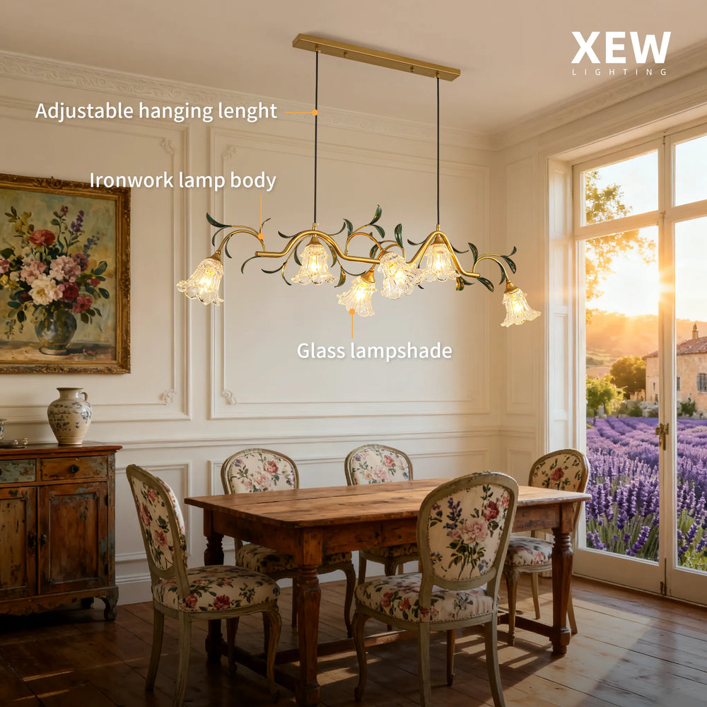 Bring the charm of a rustic garden indoors with this stunning linear pendant light. Featuring a graceful, intertwining vine frame accented with delicate leaves and blooming floral glass shades, it casts a warm, inviting glow. This fixture is the perfect centerpiece to transform your dining room or kitchen island, elevating everyday meals into special occasions.